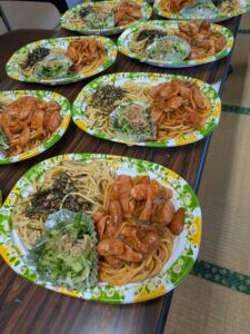 【R7.5.13(火)】地域のお茶の間in大船渡地の森 2026-02-02 14:27 立てる方は立って脳トレと簡単ストレッチをしました。水分補給も必要ですね。 リクエストのスパゲッティは、ナポリタンと和風ツナの2種。ゴージャスに出来ました。
