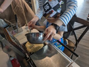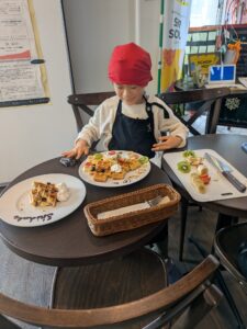 【R7.5.18(日)】まんまるひろば(親子料理教室)inソラカフェ 2026-01-31 08:08 今回は「ワッフル」に挑戦しました。 オーナーからプレートにメッセージの書き方を教えてもらい、焼いたワッフルをフルーツ、ソースなどで飾りました。か なりボリュームのあるプレートになりました。美味しく出来て大満足でした!