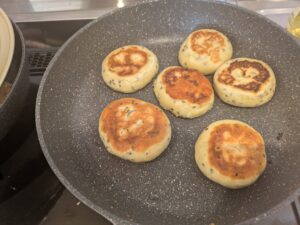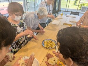 【R7.6.19(木)】地域のお茶の間in県営南青山AP 2026-02-02 16:29 簡単な脳トレと体操をしました。この日は暑くて冷房室内でも汗をかいてしまいます。 リクエストのお菓子作りは、フライパンでつくるごまチーズパンとクレープ。包み方にも飾り付けにも個性が出ますね。 何より、みんなで笑って一緒に作っておしゃべりするのが一番の健康法です。なんと男性2名が参加してくれました。