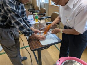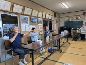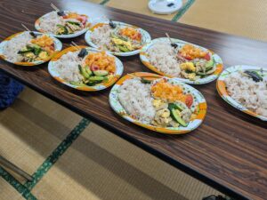 【R7.7.15(火)】地域のお茶の間in大船渡地の森 2026-02-02 16:31 台風直撃はなかったですが雨模様でお休みの方が数人いました。 92歳の男性は今日も元気に参加してくれました。 簡単な脳トレでも汗ばみました。 今回のメニューは、胡瓜と豚肉の中華炒め、トマトサラダ、雑穀ごはん。 人参ドレッシングは男性陣がすりおろして作りました。(すりおろしは92歳、サポートは82歳位)