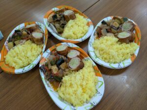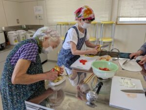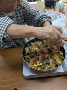 【R7.8.30(土)】地域のお茶の間in山田北浜アパート 2026-02-02 16:33 この日は久しぶりにとても暑く、急なお休みの方もいました。 集会施設にエアコンは必須です。 91歳の方、初めてペッパーミルを使いました。前回から参加している男性も、皆さんに教えてもらいながらの作業。楽しいみたいです。 メニューは、ターメリックライス、ラタトゥイユ、キャベツの豚巻き。